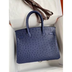 Hermes Birkin 30 Retourne Handmade Bag In Blue de Malte Ostrich Leather