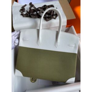 Hermes Birkin 35 Handmade Bag in Green Toile & White Clemence Leather