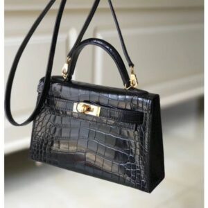 Hermes Kelly Mini II Handmade Bag In Black Crocodile Embossed Leather