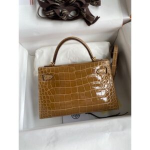 Hermes Kelly Mini II Sellier Handmade Bag In Ficelle Shiny Alligator Leather