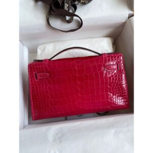 Hermes Kelly Pochette Handmade Bag In Red Shiny Alligator Leather