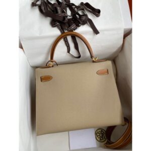 Hermes Kelly Sellier 25 Verso Handmade Bag in Craie and Biscuit Epsom Calfskin