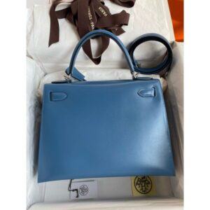 Hermes Kelly Sellier 28 Handmade Bag in Blue de Malte Ostrich Leather