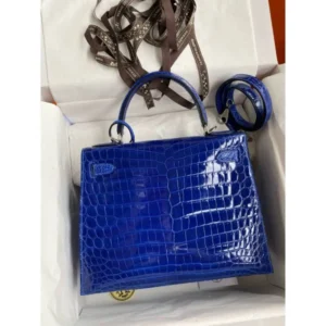 Hermes Kelly Sellier 28 Handmade Bag in Blue Electric Niloticus Crocodile Shiny Skin
