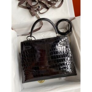 Hermes Kelly Sellier 28 Handmade Bag In Black Crocodile Niloticus Shiny Skin