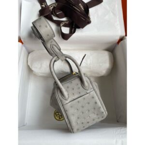 Hermes Mini Lindy Handmade Bag In Pearl Grey Ostrich Leather
