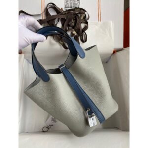 Hermes Picotin Lock 18 Bicolor Handmade Bag in Gris Mouette and Blue Agate Swift Leather