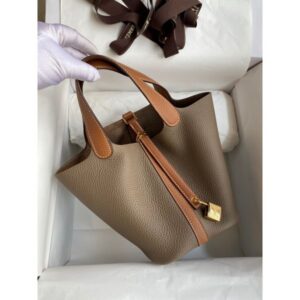 Hermes Picotin Lock 18 Bicolor Handmade Bag in Taupe and Gold Clemence Leather