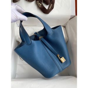 Hermes Picotin Lock 18 Handmade Bag in Blue Lin Clemence Leather