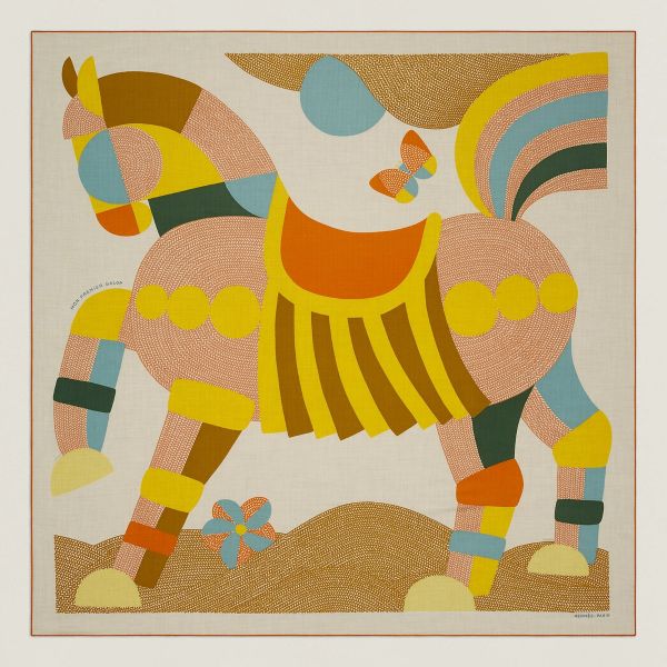 With his slightly hesitant yet intensely happy gait, this horse evokes the fragility and boldness of first steps… a magical moment, a moment of grace. The illustrator, Tong Ren, is an artist of Chinese origin whose designs delicately combine simple lines with sophisticated motifs of meticulously detailed passementerie. Mon premier galop also reveals his fondness for traditional crafts, particularly his love of wicker baskets and woven straw hats.