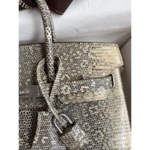 First adorned on the arm of the infamous Jane Birkin back in 1984, the Hermes Birkin Bag quickly soared to the top of the popularity charts, becoming one of the most sought after bags in the fashion industry. The Retourne style Birkin bag has a soft and relaxed look. Made from Lizard leather, this skin is extremely valuable and rare and is processed as little as possible to maintain its natural texture. The 25 cm size is a glamorous choice for day to evening, cocktails or the red carpet.