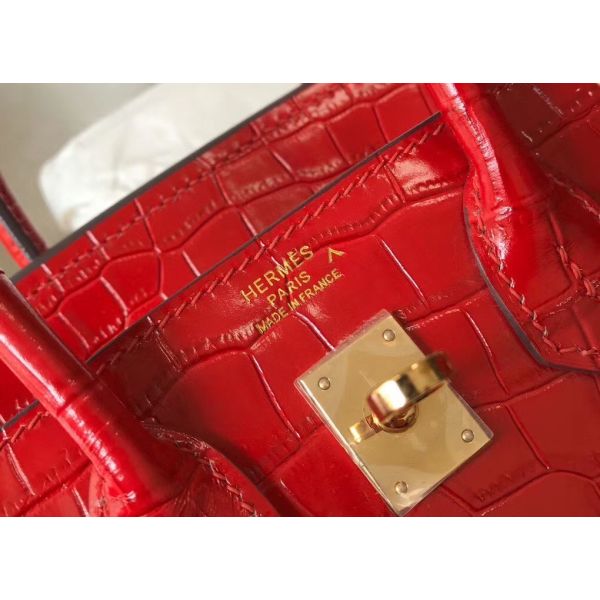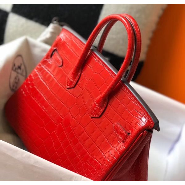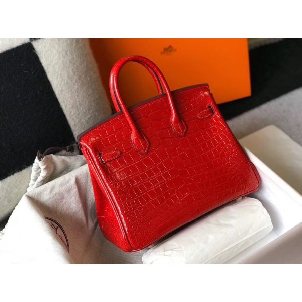 Hermes Birkin 25cm Bag In Red Embossed Crocodile Leather