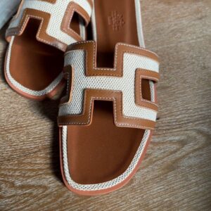 Hermes Oran Slide Sandals in Gold Swift Calfskin with Canvas