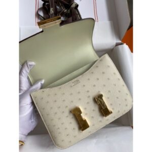 Introduced in 1969, the Hermès Constance quickly became one of the most highly sought-after of the brand’s luxury bags, behind only the Kelly bag and the Birkin. The Hermès Constance 18 is a stylish shoulder bag designed with versatility in mind. The Constance 18, also referred to as the Hermès Constance Mini. The squarish shape and large, prominent “H” closure across the front give this bag a youthful appeal, even when rendered in a sophisticated Ostrich skin, this leather skin is extremely durable and can be wiped down if wet to maintain its appearance.