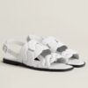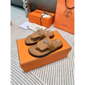 Hermes Oran Slide Sandals in Gold Swift Calfskin with Canvas