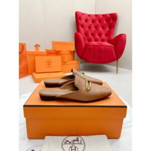 Hermes’s slippers have been crafted from smooth calfskin leather and topped with gold-plated Roulis hardware etched with house’s moniker. They have round toes and a slight heel for added lift. Wear them with with cropped tailoring.