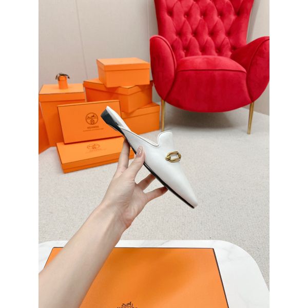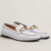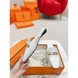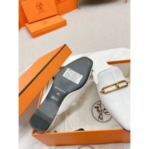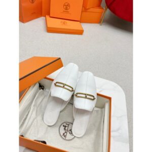 Hermes’s slippers have been crafted from smooth calfskin leather and topped with gold-plated Roulis hardware etched with house’s moniker. They have round toes and a slight heel for added lift. Wear them with with cropped tailoring.