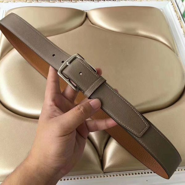 Etoupe epsom and brown clemence leather Hermès 40MM Etrivière belt with tonal stitching and silver palladium plated buckle closure with adjustable with 5 holes.