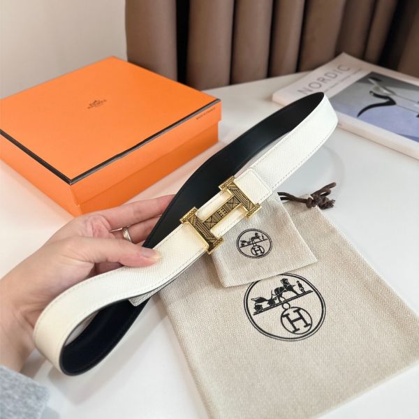 Hermes H Guillochee Reversible Belt 32MM in Gold and White Epsom Calfskin