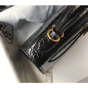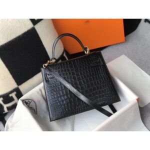 Hermes Kelly 25cm Handmade Bag In Black Embossed Crocodile Leather