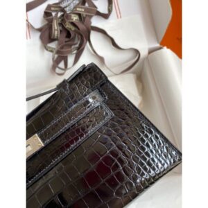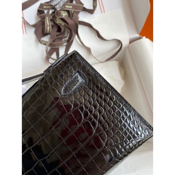 Hermes Kelly Pochette Handmade Bag In Black Shiny Alligator Leather