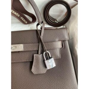 The iconic trapezoid shape of the Hermes Kelly 32 was a striking departure from the ornate handbag styles of the day. The chic look took the world by storm when legendary actress, and crowned princess of Monaco, Grace Kelly was photographed holding her Hermès Sac à Dépêches bag to shield her baby bump from the paparazzi. This Kelly 32 bag in Retourne, a relaxed style made by placing the stitches inside the bag, thanks to the taurillon Clemence leather. It is an ideal daily bag for the busy woman on the go. It is spacious enough to carry all your everyday essentials.