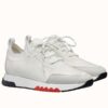 A reinterpretation of a classic style, The Hermes Addict Sneaker in bicolor knit with optical illusion, these pairs feature petrol zigzag rubber insert on the front and grey rubber insert on the back, white rubber midsole and white goatskin insole and lining.