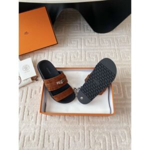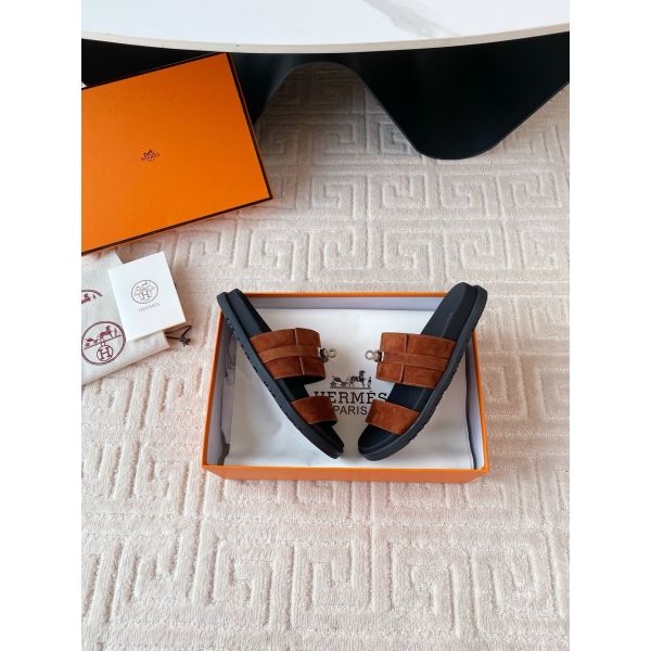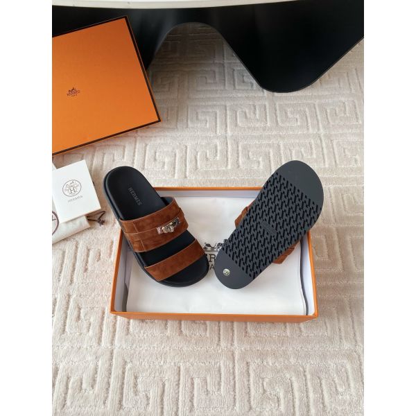 The Hermes Jackson sandal offers an elegant style with relaxed appeal. The design presents the straps, highlighting the suede calfskin. Completed by a Hermes signature on the Kelly buckle and black rubber sole, the sandal will pair easily with Bermuda shorts or jeans.