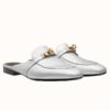 These stylish mules are crafted of black leather with insoles of green leather and a two-inch stacked wooden heel. They feature a cross over strap with a large palladium silver Hermes H. These are casual slip-on for everyday comfort, with the classical sophistication of Hermes!