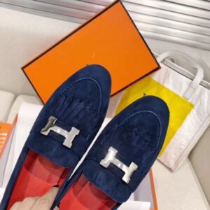 Hermes reworks its coveted ‘Royal’ loafers for the new season with a comfortable rubber heel. This suede leather pair is decorated with a fringed trim that tops the neat toe. We like how the palladium-plated H buckle has an aged finish to mark it out as a heritage feature.