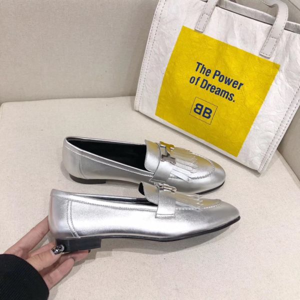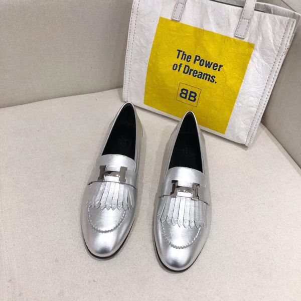 Hermes reworks its coveted ‘Royal’ loafers for the new season with a comfortable rubber heel. This lambskin with metallic finish pair is decorated with a fringed trim that tops the neat toe. We like how the palladium-plated H buckle has an aged finish to mark it out as a heritage feature.