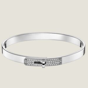 The Kelly is a name synonymous with Hermes. It is a symbol of their wondrous dedication to craftsmanship and classic style. First designed by Robert Dumas, the Kelly bag is known and coveted around the world. The lock of the bag, which is a turn lock, now appears in bracelets and jewelry. This bangle bracelet also carries the iconic Kelly lock. The lock is breathtakingly decorated with diamonds and each one is placed to catch the light at every angle. Brimming with lavish details and artistry, this wondrous creation deserves to be yours.