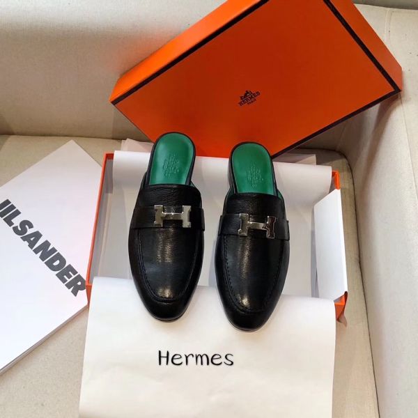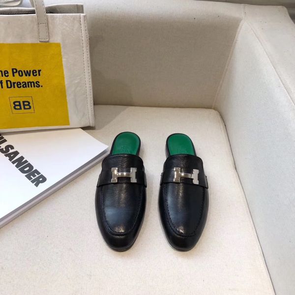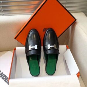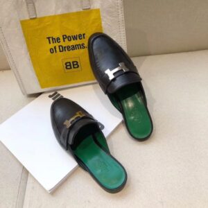 Hermes’s iconic Trocadero mule is reinterpreted this season in goatskin with an “H” detail in palladium plated. This timeless style features a monobloc construction combining several layers of leather for a thick, hard-wearing outsole and a comfortable insole.