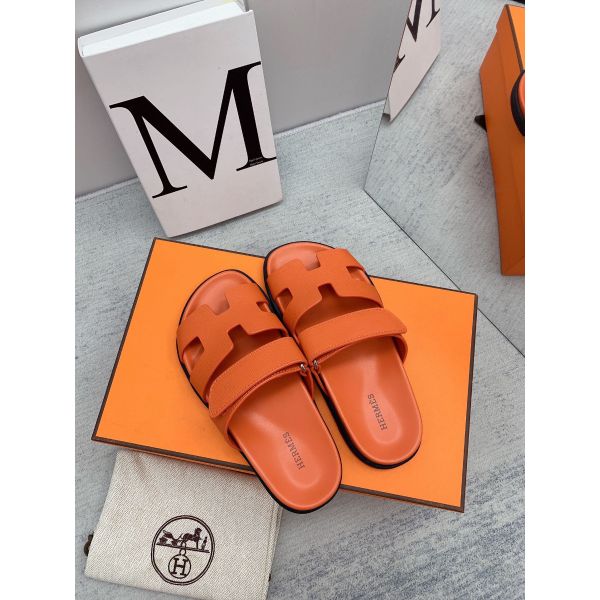 Hermes Oran Slide Sandals in Gold Swift Calfskin with Canvas